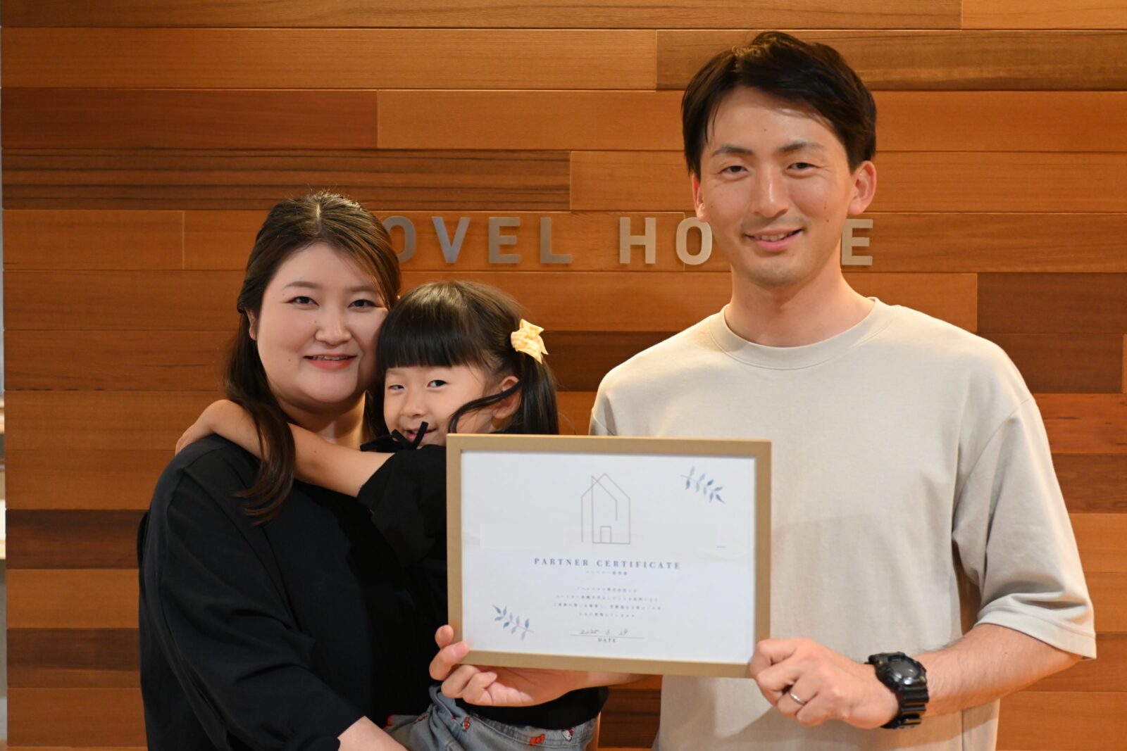 お写真は、ノベルハウスのロゴを背景に「パートナー証明書」を持っていただいた記念の1枚。
