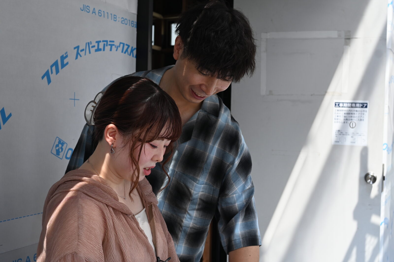 お施主様も、現場に立って上を見上げながら
