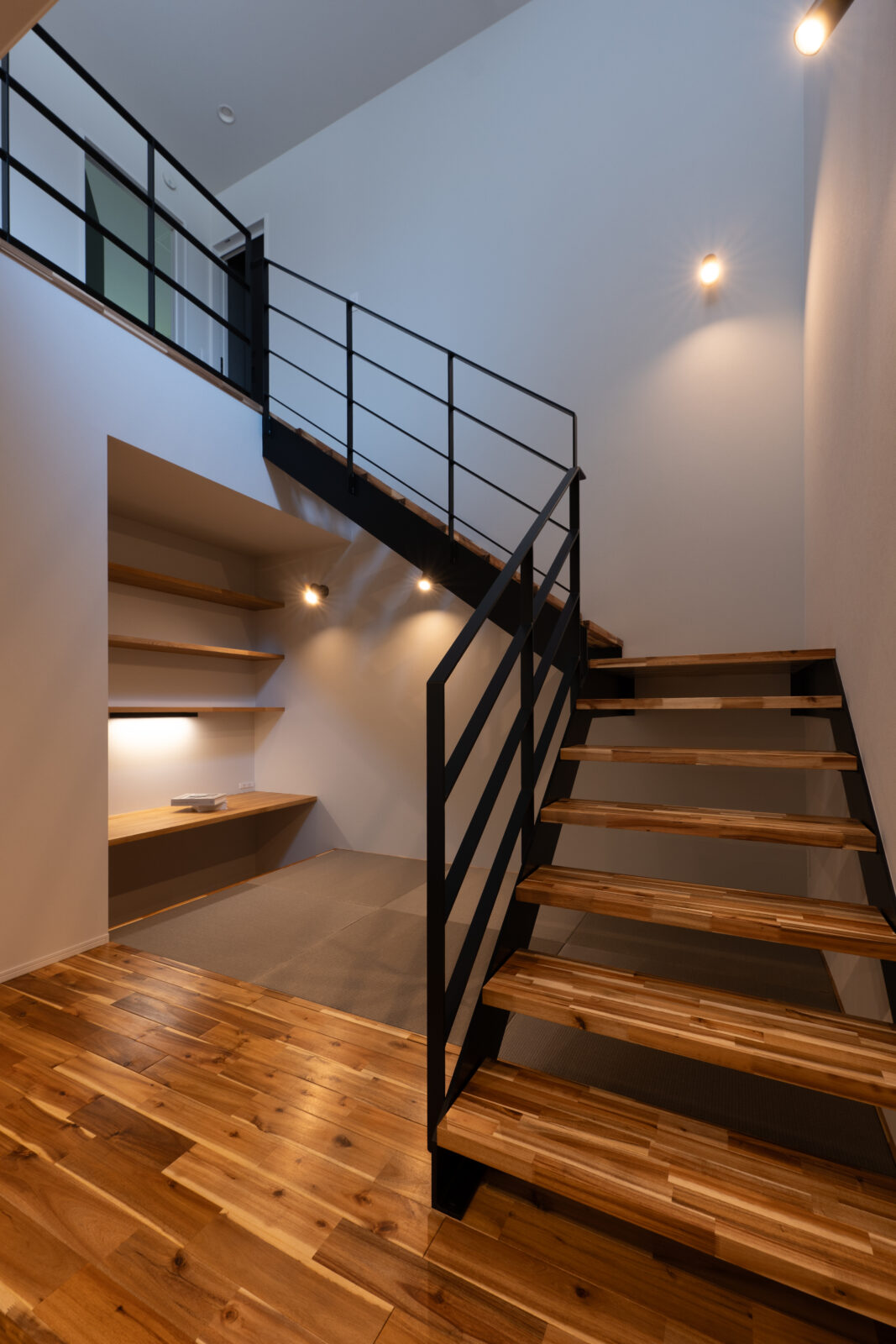 階段下の畳スペースが、穏やかな安らぎの場をつくり出す。